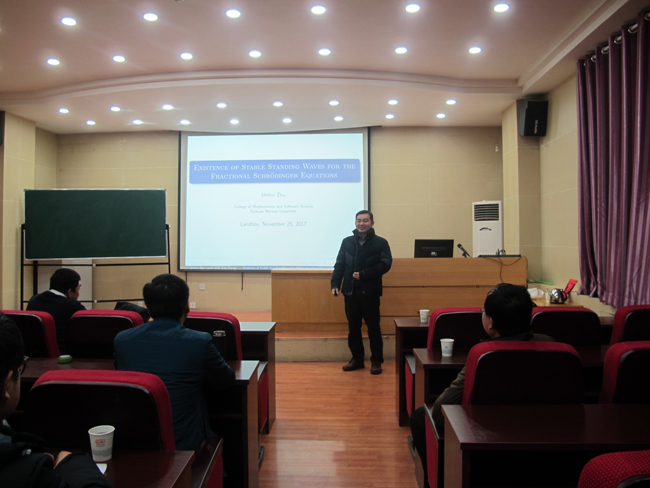 应学院邀请,四川师范大学朱世辉副教授于2017年11月23日到26日访问beat365,并在25日上午作了题为《Existence of Stable Standing Waves for the Fractional Schrodinger Equations with Combined Nonlinearities》的学术报告。相关专业教师、研究生共50余人参加了报告会。