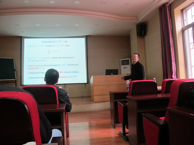 杨大春教授在第一场报告中,通过介绍Lebesgue空间, Hardy空间以及BMO空间的概念及性质,对函数空间的实变理论做了系统性的介绍。基于这些新的特征,相应地介绍了该问题的研究进展以及本人近期的主要研究成果。在第二场报告中,介绍了输送方程和流有关背景,将Diperna-Lions 和Ambrosio在输送方程和流的结果进行了进一步推广,找到了关于向量场的散度的最佳条件使得相应的输送方程和流的解是适定的,并且给出了反例说明所做的结果是最优的。