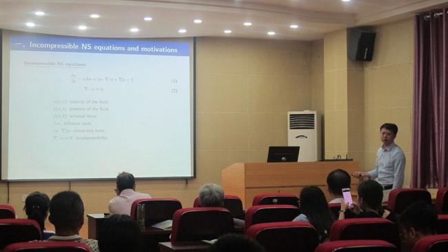 赵才地教授详细介绍了Navier-Stokes方程的背景以及国内外的最新研究进展和研究中存在的问题和困难,然后讲解了由非自治全局修正Navier-Stokes方程组的解算子生成的过程存在拉回吸引子和过程存在不变的Borel概率测度,并且该测度的支集就包含于拉回吸引子当中。 最后对解不一定具有唯一性的耗散系统(例如三维不可压Navier-Stokes方程组)的不变测度与统计解的构造问题作了一些探讨。