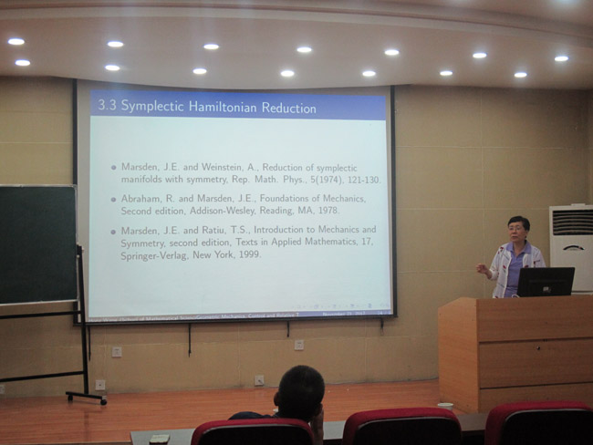 报告中,王教授系统阐述了Hamiltonian系统约化理论的研究背景和研究意义,详细介绍了辛流形、Poisson流形及Dirac流形上的Hamiltonian系统,并对该系统的约化理论及具体应用做了精彩的讲解,特别对需要考虑的具体问题做了详尽地分析。同时,王教授结合带有控制的Hamiltonian系统及其约化理论的建立过程,详细地讲述了团队的研究经历和研究成果。最后,王教授与参会师生就有关学术问题做了深入交流,耐心地回答了师生们的提问。报告极大地拓展了大家的学术视野,王教授科研团队的治学精神也让大家深受鼓舞。