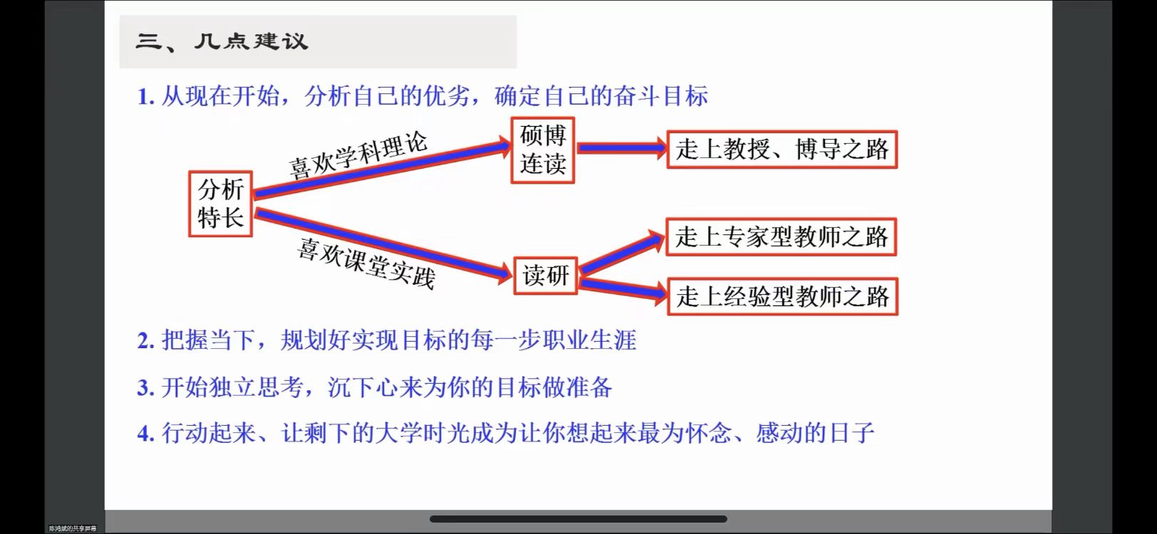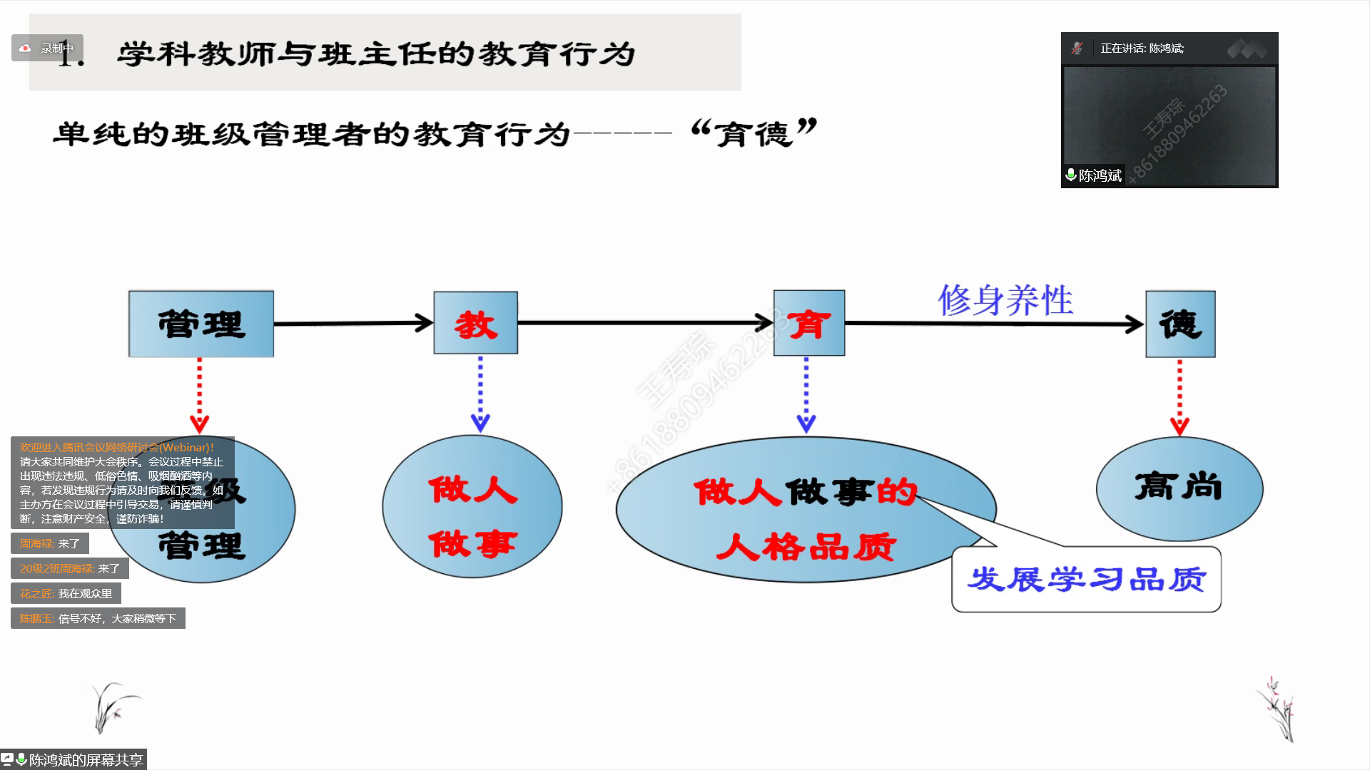 陈鸿斌老师主要从学科教师与班主任的教育行为和专业发展轨迹两大方面进行了分享。他谈到,教师最重要的素养是如何“教”和“育”。作为一名优秀的班主任要具备六项基本条件:名、权、势、威、信、行。一个优秀的班主任必须建立在“有名有权”的基础上,站在维护大多数同学的利益角度管理班级秩序,才能形成以班主任为中心的优秀的班集体;要做到自我理性,做事诚实,有上进心,才能使整个班集体信服:同时班主任也是全班的榜样,要为全班学生起到带头作用,让学生们行动起来,营造出良好的班风,长此以往,良好班风便会激发学生向上能力的发展。陈老师还分享了当代大学生要走专业发展道路的原因及其发展要素,建议同学们要坚定自己的奋斗目标、把握当下,规划好实现自我职业生涯目标的每一步,并鼓励同学们要独立思考、砥砺前行、积极进取。他谈到:“做一个积极努力的人,每个人都愿意帮助积极向上的人,但如果你自己不先做出一点努力的样子,别人想拉你一把都不知你的手在哪里”与同学们共勉。