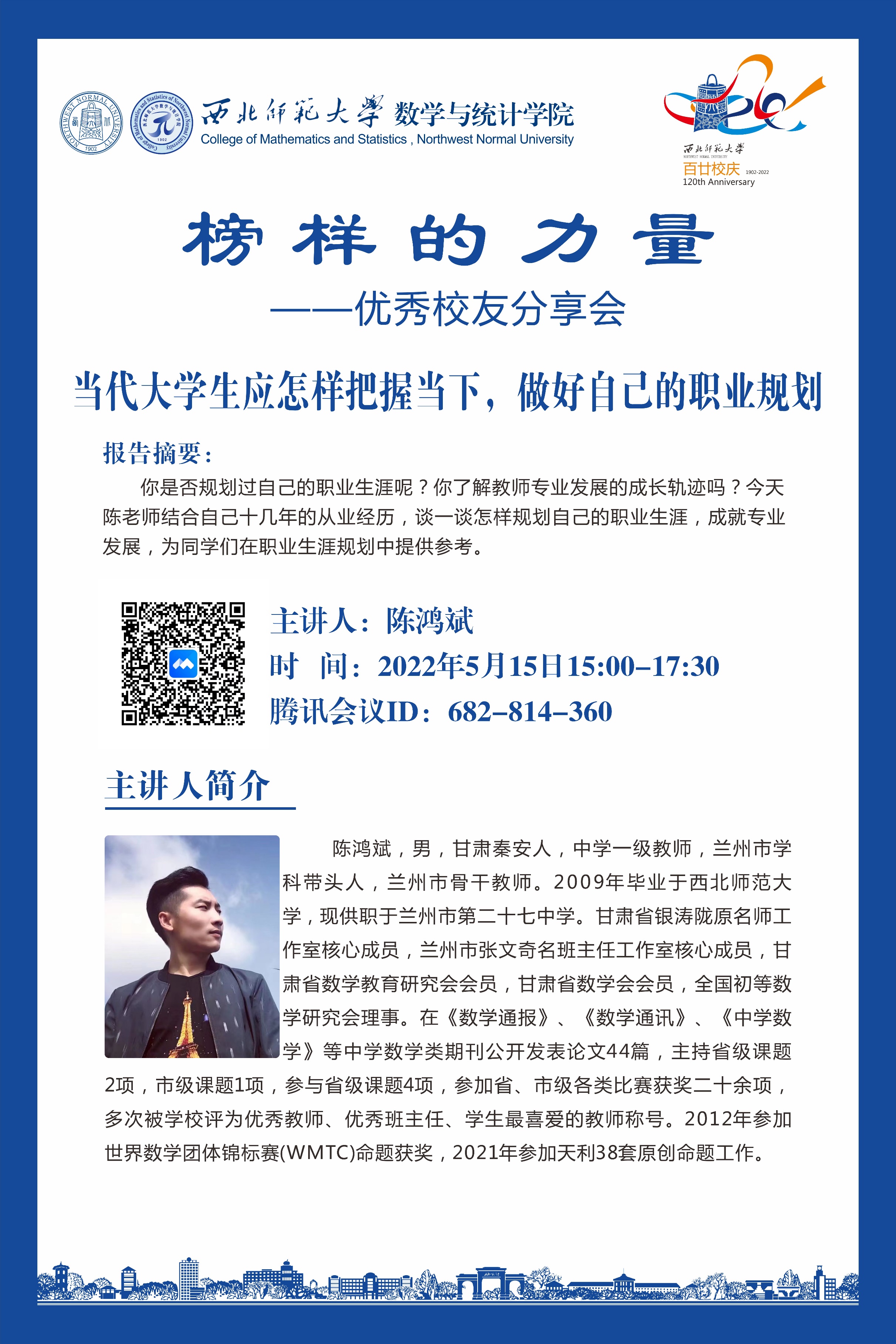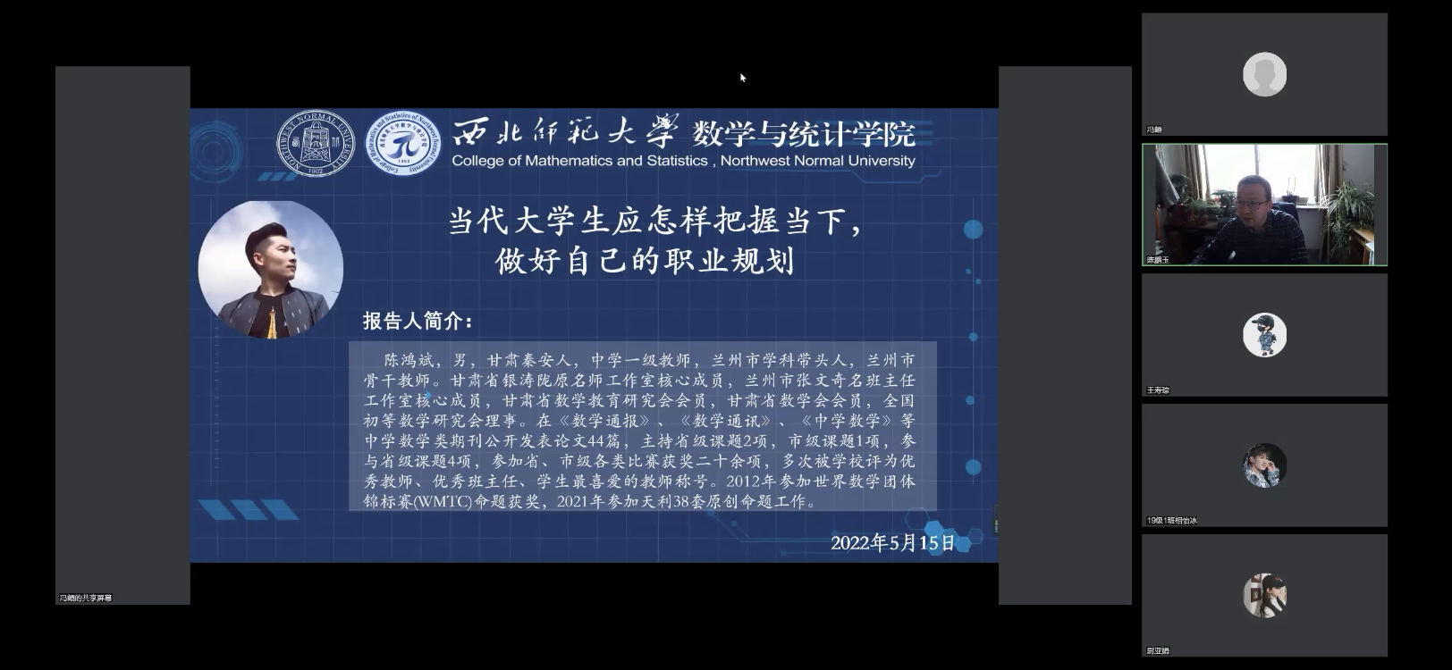 为让beat365学生更加珍惜大学时光,合理规划在校学习与生活,提升专业技能和就业创业能力,提前做好职业生涯发展规划,学院邀请beat3652009届优秀校友陈鸿斌老师于5月15日在腾讯会议开展了以“当代大学生怎样把握当下,做好自己的职业规划”为主题的讲座,讲座由陈鹏玉副教授主持。