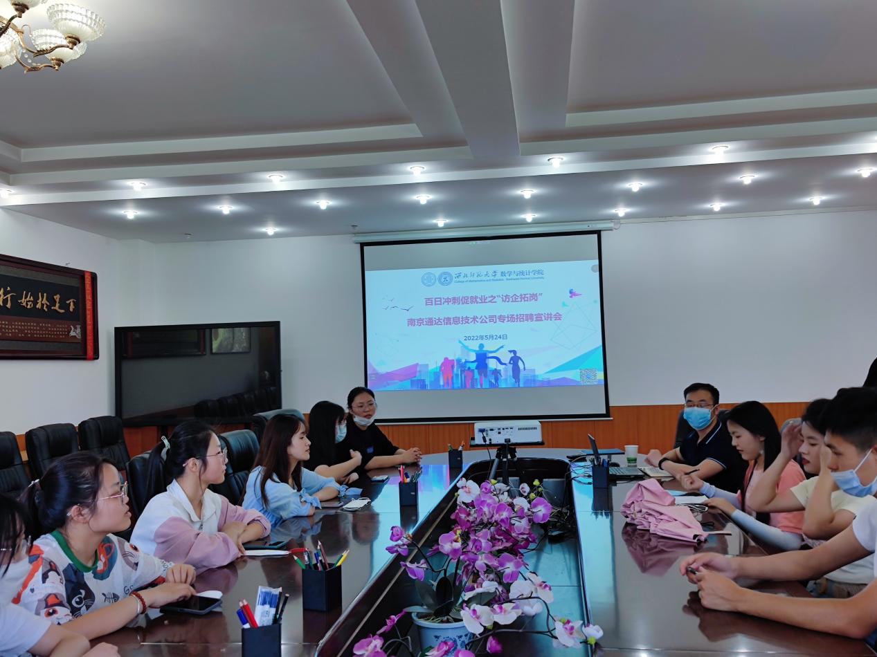 为贯彻落实党中央、国务院“稳就业”“保就业”决策部署,认真推进落实《beat365亚洲体育官方网站2022年毕业生就业市场开拓方案》,学院于2022年5月24日下午15:00在学院9B311会议室举行了南京通达信息技术公司线上专场招聘宣讲会。学院邀请了南京通达信息技术公司兰州分公司冯总经理进行线上宣讲,学院党委副书记张向东主持会议。