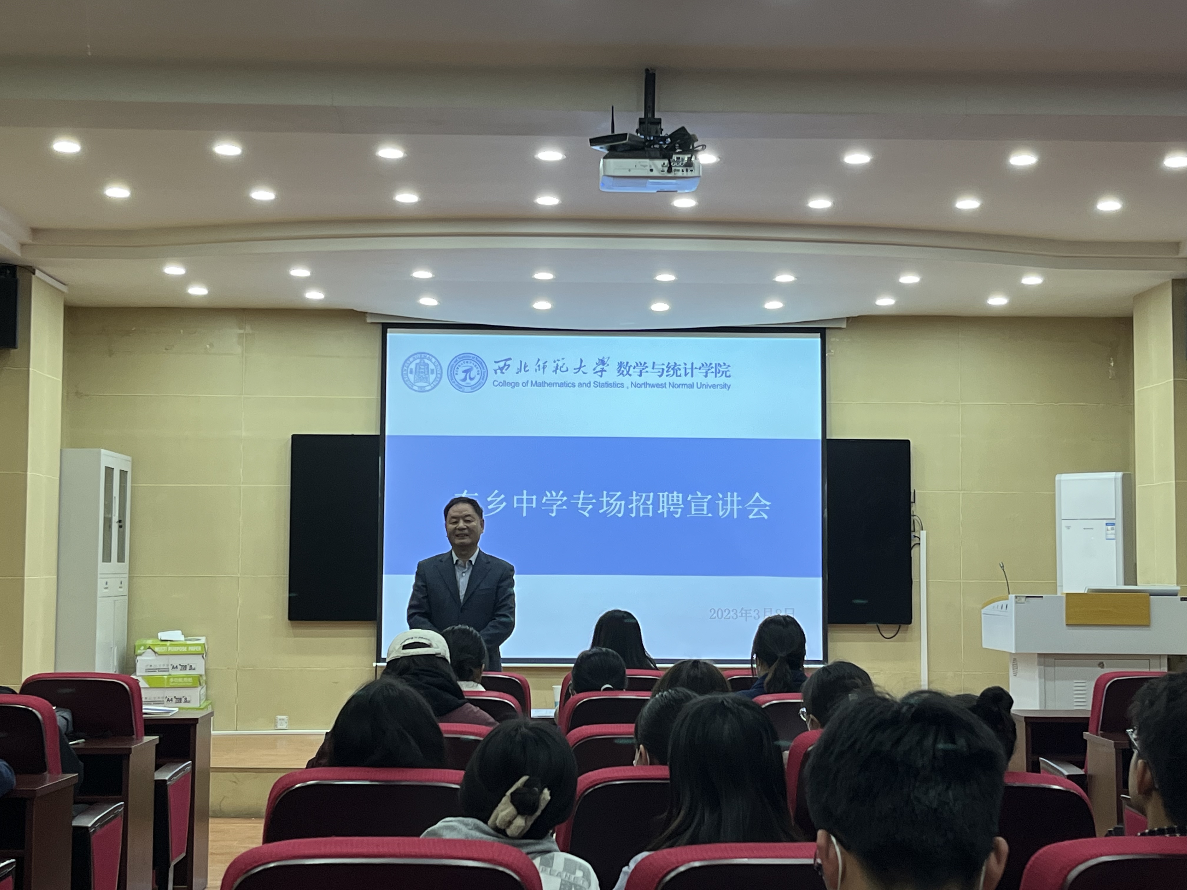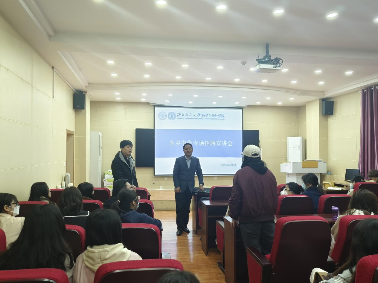 会上,东乡中学负责人从临夏州东乡中学的区位优势、办学条件、薪资待遇、未来的职称晋升、发展前景等方面进行了详细的说明。鼓励同学们要对自己的未来有一个清晰的认识和规划,要转变就业观念,抓住就业机会,要有服务基层的意识,把个人成长与民族复兴伟业紧密联系起来,珍惜难得机遇,投身创业沃土,用个人所学和专业所长服务临夏高质量发展,展现新时代青年学子的使命担当和精神风貌。参会的同学们就自己关心的问题进行了提问。