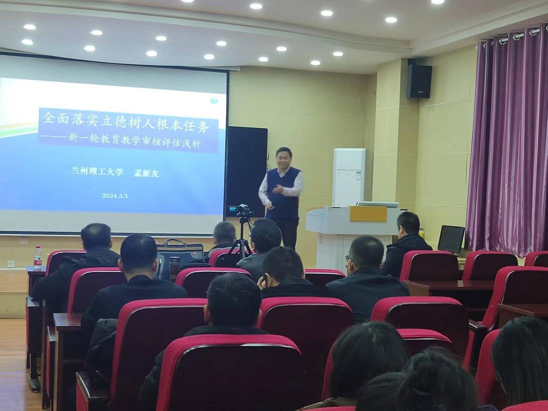 3月3日下午,学院邀请兰州理工大学理学院副院长孟新友教授为beat365教师做了题为“全面落实立德树人根本任务——新一轮教育教学审核评估浅析”的报告。报告会在致勤楼C101进行,由杨和副院长主持,学院领导班子全体成员,各系、所、中心主任、团学工作负责人及全体班主任出席报告会。