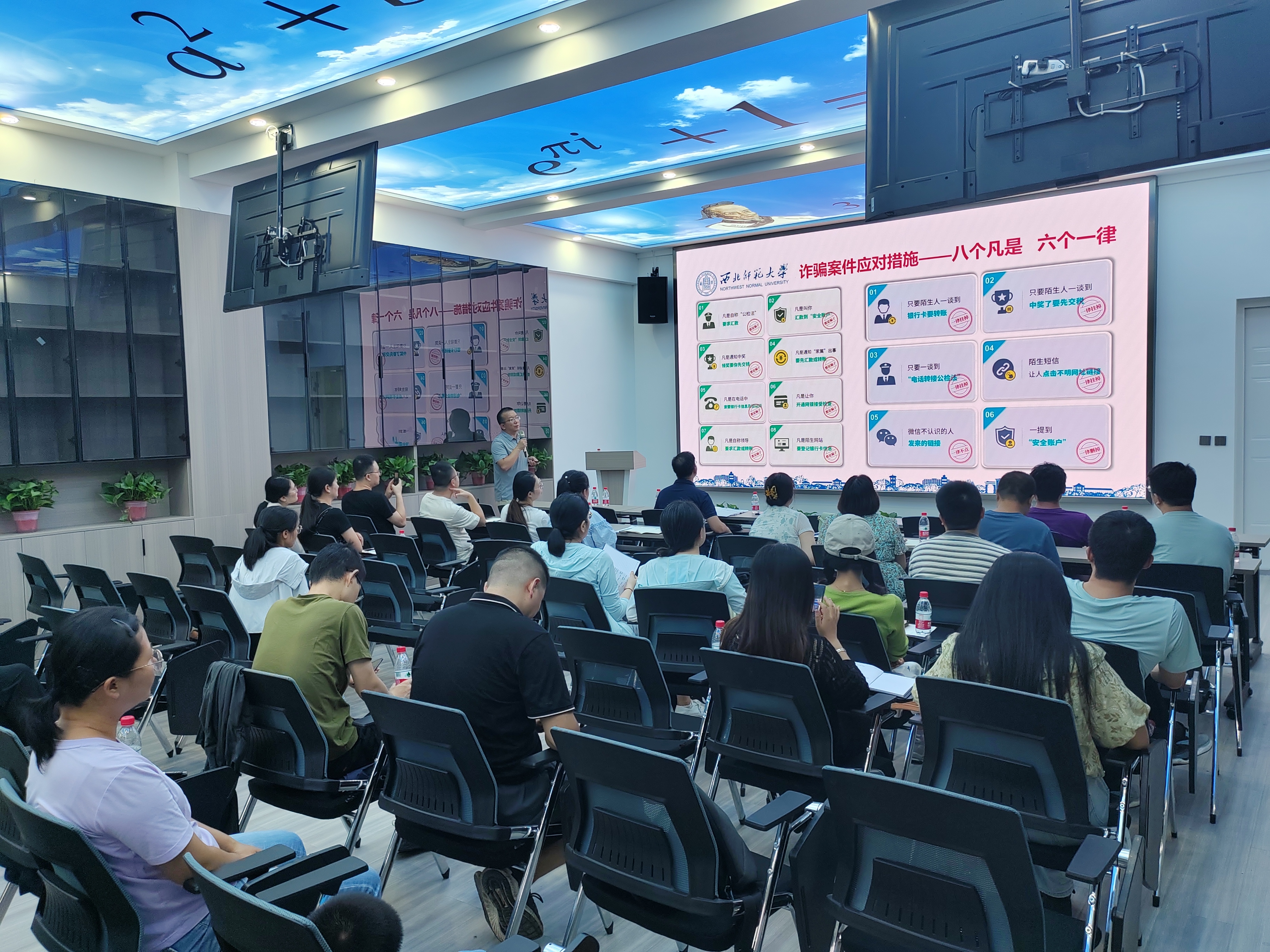 石晓东副处长作了题为《预防为主 生命至上—学生安全教育专题》讲座,他从安全工作概述,电信网络诈骗案例分析和电信诈骗防范策略等方面做了精彩分析,指出安全工作即是学校的生命线,也是学校的底线,各位班主任要把维护学生的生命安全放到所有工作的首位。同时,他还列举了大量校园失窃、人身伤害、溺水和交通事故等案例,这对于班主任正确引导广大学生树立起安全意识,帮助学生提高防范能力,创建平安校园具有很好的启发意义。