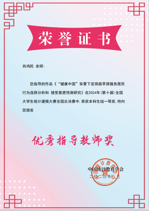 此赛事吸引了来自全国各地的众多高校参赛,竞争异常激烈。荣获本科组全国一等奖团队通过深入的数据分析和精确的模型构建,开展了《“健康中国”背景下宫颈癌早筛服务居民行为选择分析和接受意愿预测研究》,展示了团队在统计建模领域的卓越能力和团队合作精神,评委们对他们的作品给予了高度评价,不仅为学校争得了荣誉,也为团队成员的学术生涯增添了浓墨重彩的一笔。beat365亚洲体育投注肖鸿民教授同时获得了“优秀指导教师“的殊荣。