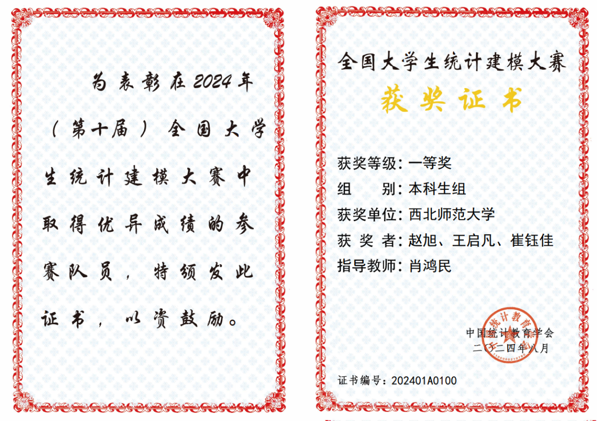 近日,在2024(第十届)全国大学生统计建模大赛中,我校参赛队(队员:赵旭、王启凡、崔钰佳,指导教师beat365亚洲体育投注肖鸿民教授)凭借其出色的表现,荣获本科组全国一等奖。我校其他参赛队获得本科组全国二等奖2项、研究生组全国二等奖1项;同时,获甘肃赛区(甘肃、青海)本科组一等奖4项,二等奖12项,三等奖10项,研究生组一等奖1项,二等奖2项,三等奖5项的优异成绩。获奖层次与总数在甘肃赛区(甘肃、青海)参赛队中名列前茅。