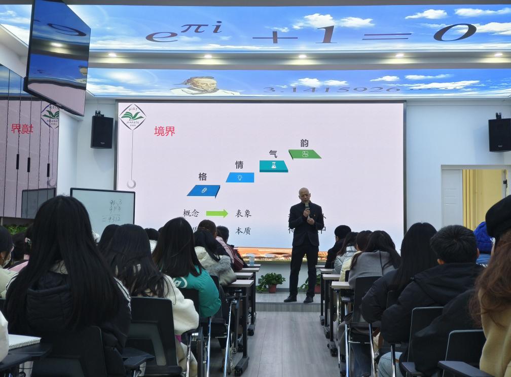 马宝林以独特的自我介绍激发了参会者对数学的兴趣。接着从问渠那得清如许、繁花犹须绿叶配、纸上得来终觉浅、绝知此事要躬行四个方面展开,对文字之韵、艺术之雅,数学之美三者之间的区别与关联结合多个经典案例展开示范与解读,鼓励同学们为数学文化传播奋楫扬帆,实现形式与内涵、课内与课外、感性与理性的结合。报告深入浅出、语言诙谐幽默、风格新颖独特,不仅拓宽了师生的视野,为师范生未来的教学指明方向,让在场的每一个人都深刻感受到了数学的魅力。