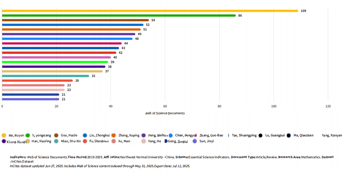 根据科睿唯安(Clarivate Analytics)于2025年7月10日公布的ESI(Essential Science Indicators,基本科学指标数据库)最新数据显示,西北师范大学数学学科新晋为ESI全球前1%学科。这标志我校在数学学科领域迈入了国际高水平行列,实现了学科建设的新突破。