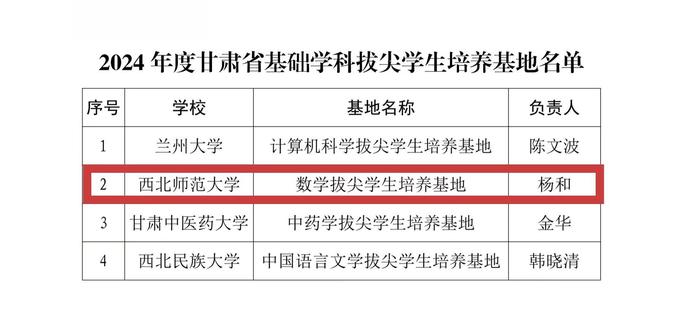近日,甘肃省教育厅公布了2024年度甘肃省基础学科拔尖学生培养基地名单,西北师大beat365亚洲体育投注“数学拔尖学生培养基地”获批甘肃省基础学科拔尖学生培养基地。